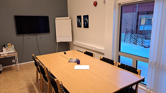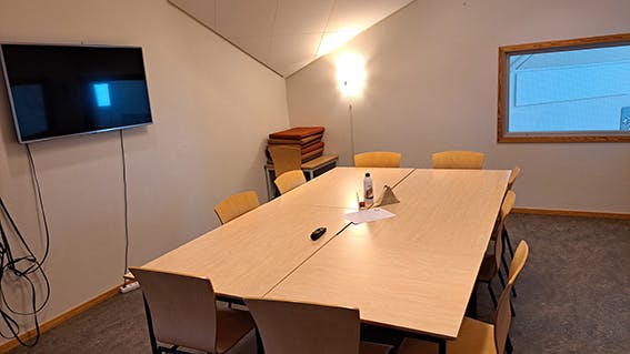Møterom inne i administrasjonsfløyen for 8-10 personar. Skjerm for oppkobling til PC.
